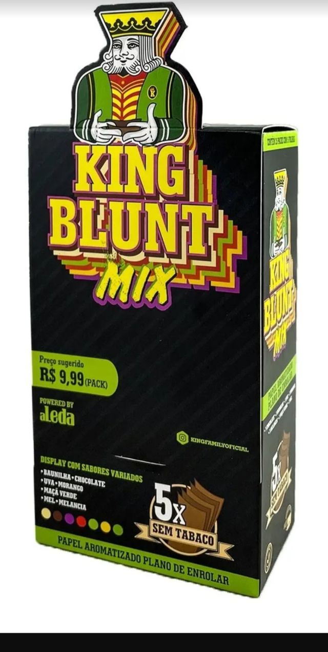 A King Blunt Mix é uma blunt feita com papel de cânhamo e sem nicotina. Seu display conta com 25 envelopes e 7 sabores diferentes, cada envelope possui 5 folhas.